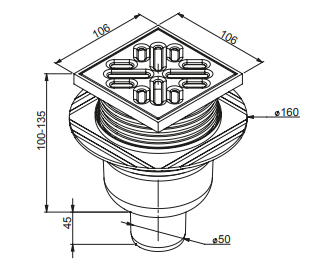 KRATKA ŚCIEKOWA PROSTA FI50mm Z REGULOWANYM POZIOMEM 106x106mm RUSZT NIERDZ. CHROM SZARY C107N PREVEX
