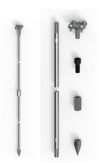 Zestaw zawiera szpic oraz zacisk, do którego należy przyłączyć bednarkę lub pręt uziemiający. Doskonale nadaje się do wykonywania uziemień w infrastrukturach energetycznych, kolejowych oraz w budownictwie. Pręty uziomowe łączy się ze sobą poprzez skręcanie za pomocą łącznika gwintowanego.