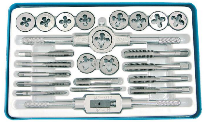 W skład kompletu wchodzą gwintowniki i narzynki 5 x 0.8, 5 x 0.9, 6 x 0.75, 6 x 1, 8 x 1, 8 x 1.25, 10 x 1.25, 10 x 1.5, 12 x 1.75, 12 x 2, 1/8 NPT 27 - po 1 szt.
